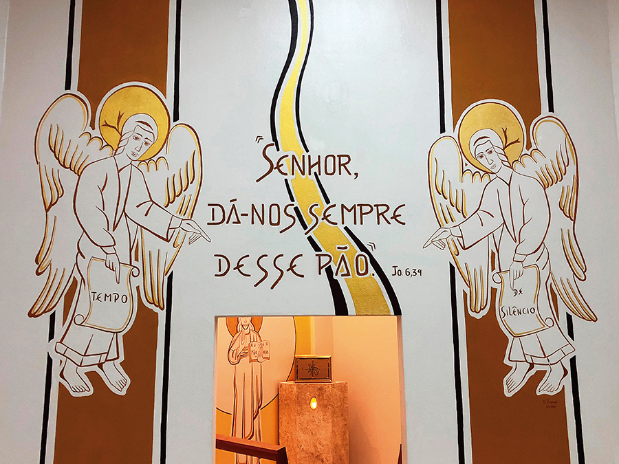 Ao entrar na capela se observa na parede frontal  ao lado direito do observador o ícone de Cristo de pé com o evangelho onde se lê: “ Eu sou o pão da vida”, ao fundo o grande círculo branco significando a Eucaristia.