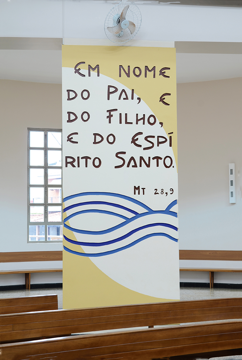 De forma que o povo ao chegar se depara com a imagem recebendo a todos e ao começar a celebração a imagem se volta para o altar e se coloca em unidade com todos para o momento celebrativo.