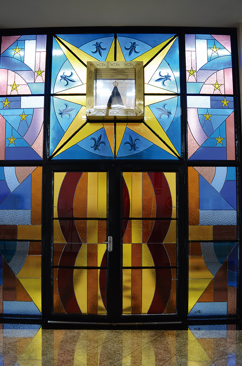 Aproveitando a ideia da localização da imagem na Basílica Nacional opostamente ao altar junto a uma das entradas assim se deu, para criar uma divisão física entre o átrio e o corpo da igreja um projeto de portal-vitral contendo ao centro o nicho giratório para abrigar a imagem da padroeira.