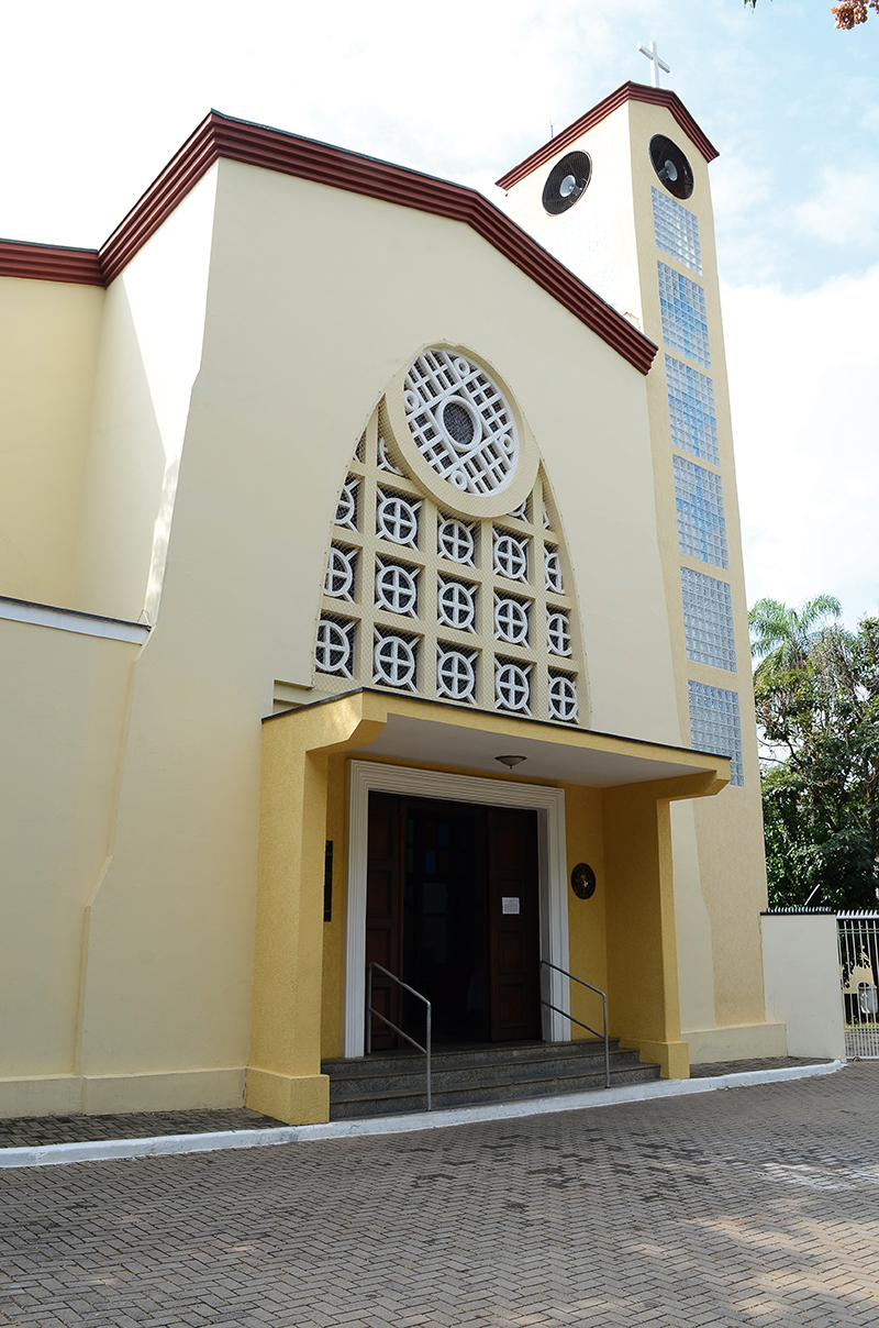 O motivo central é Jesus Cristo e está emoldurado por um arco pleno que traz um maravilhoso trabalho em gesso com ramados de feixes de trigo e cachos de uvas coloridos com detalhes em folhas de ouro.