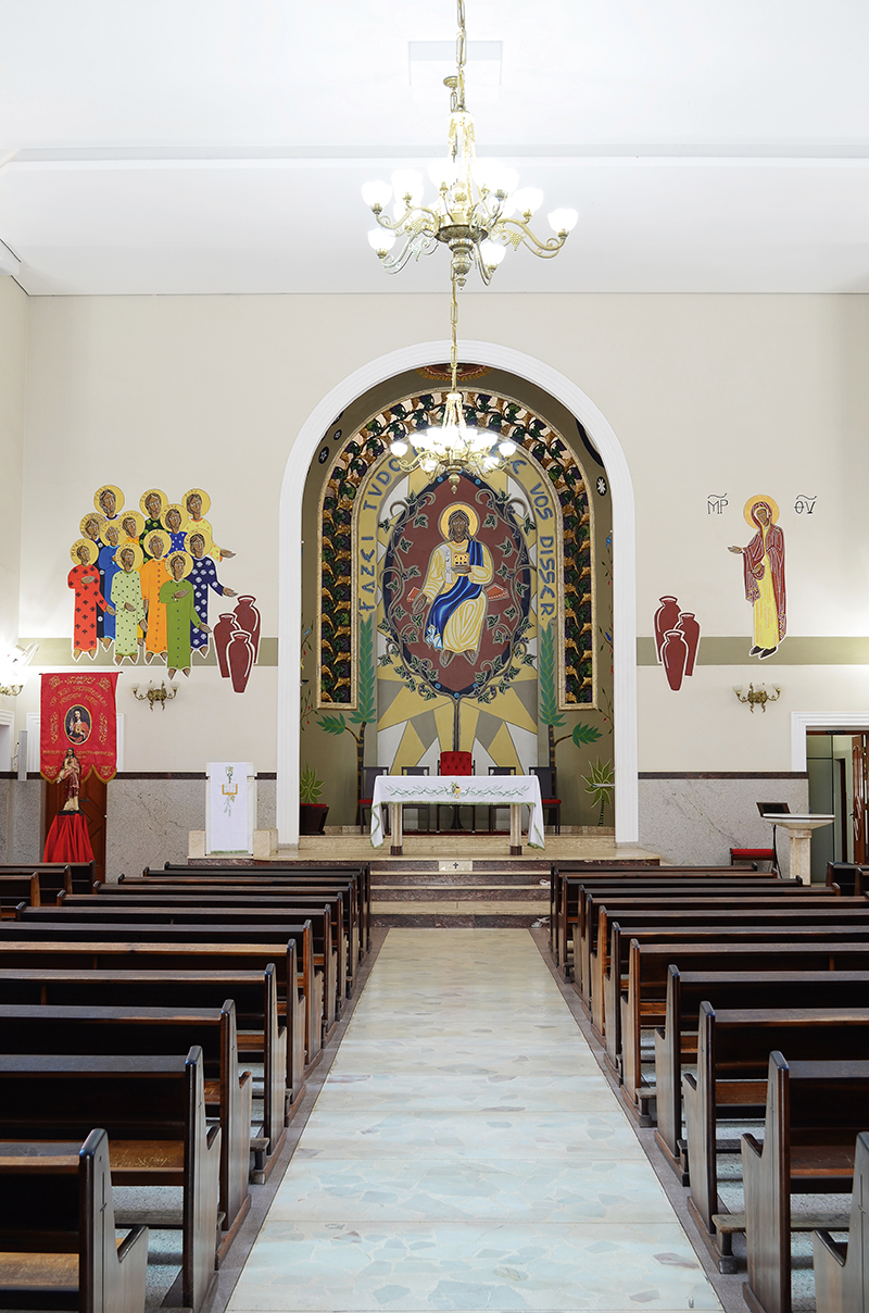 O fundo do presbitério tem um formato em semicírculo formando uma espécie de pequena ábside com abóboda no alto e neste espaço estão colocados alguns elementos da criação para lembrar que nesta festa das bodas deus realizou aliança de salvação não apenas com o gênero humano, mas com toda a criação.