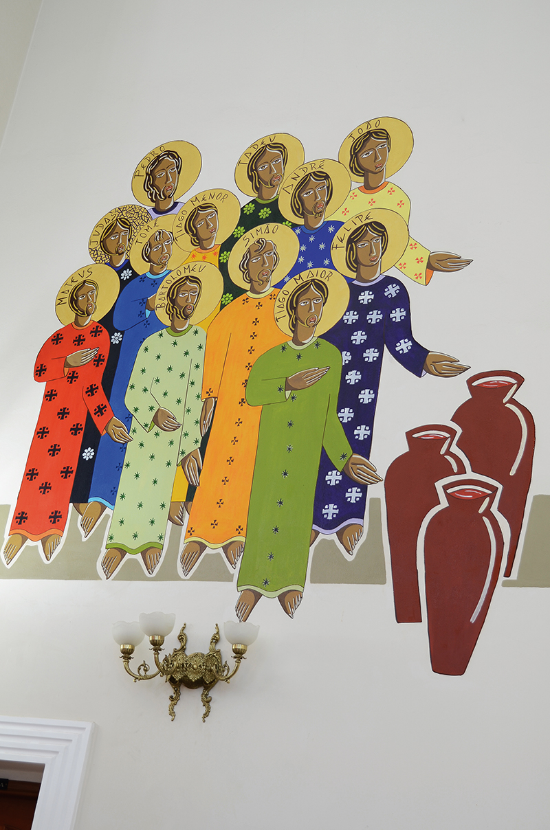 Ao lado oposto (esquerdo) está o grupo dos apóstolos em trajes bem coloridos revelando o clima festivo e alegre.