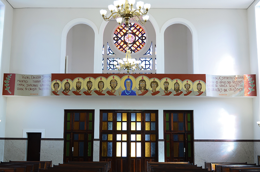 Em cada lado se delineiam seis bustos dos apóstolos com o halo de luz e a chama do fogo conforme descrição no texto de Atos.