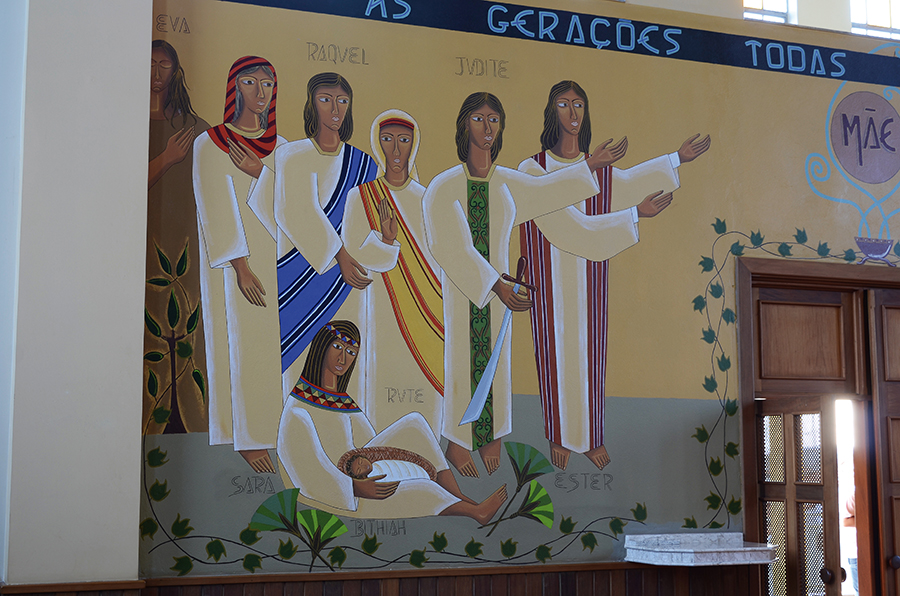 A maternidade de Maria ilumina o feminino em muitas mulheres das Sagradas Escrituras. Quem olha de frente para a imagem contempla a esquerda algumas mulheres do Antigo Testamento a começar por Eva. À direita estão mulheres do Novo Testamento e outras que viveram a vida em Cristo ao testemunho de Maria.