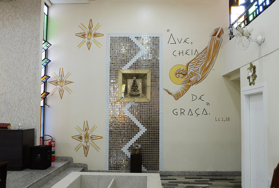 A infância de Jesus tem seu início no mistério da encarnação com a anunciação do anjo a Virgem Maria, assim se concebeu para a imagem de Nossa senhora Aparecida ao lado direito de quem está de frente ao presbitério um painel em pastilhas douradas com o nicho a guardar a imagem.