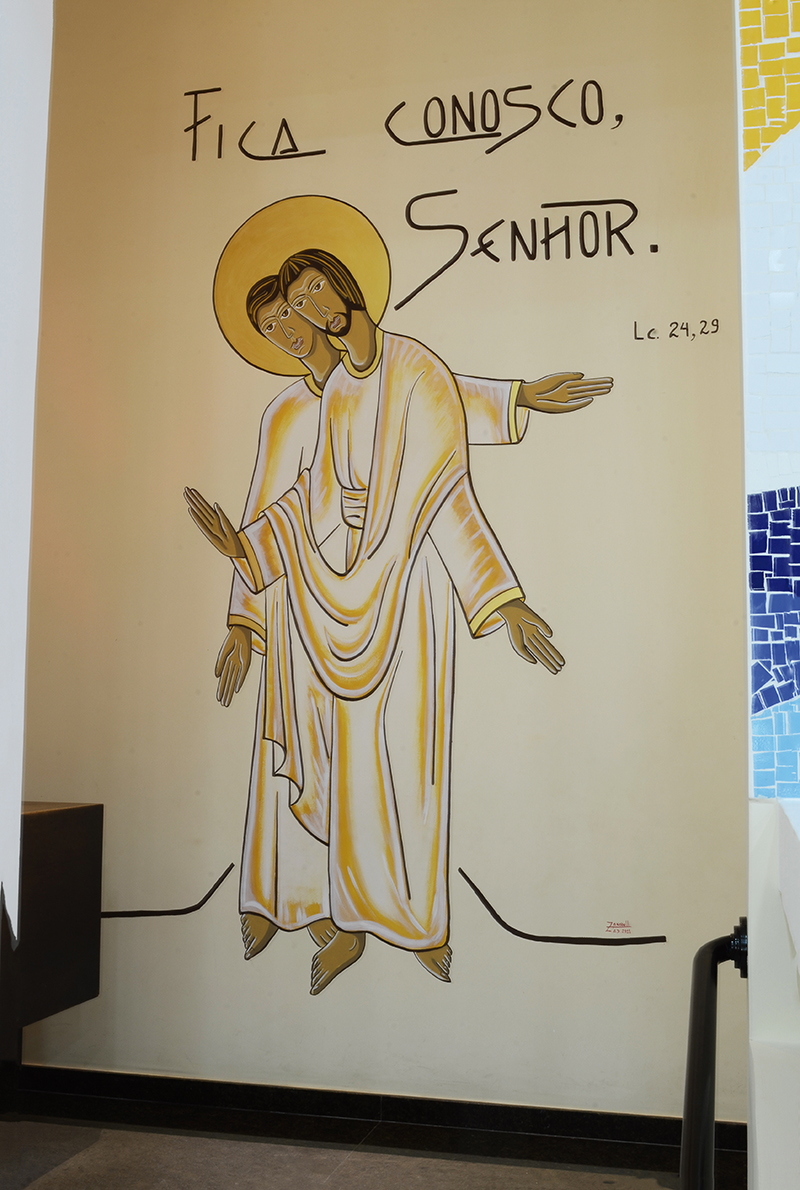 Ao lado esquerdo do presbitério está a capela do santíssimo onde ao entrar se avista na parede frontal os dois discípulos de Emaús reconfortados por reconhecerem o Senhor presente no sacrário. Ilumina o versículo: “Fica conosco Senhor”. (Lc 24,29).