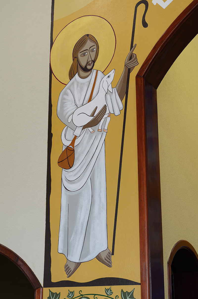 Na parede frontal à entrada do presbitério uma grande arcada recorda uma grande porta e esta motivou a apresentar o ícone do bom Pastor em unidade com a cena do batismo.