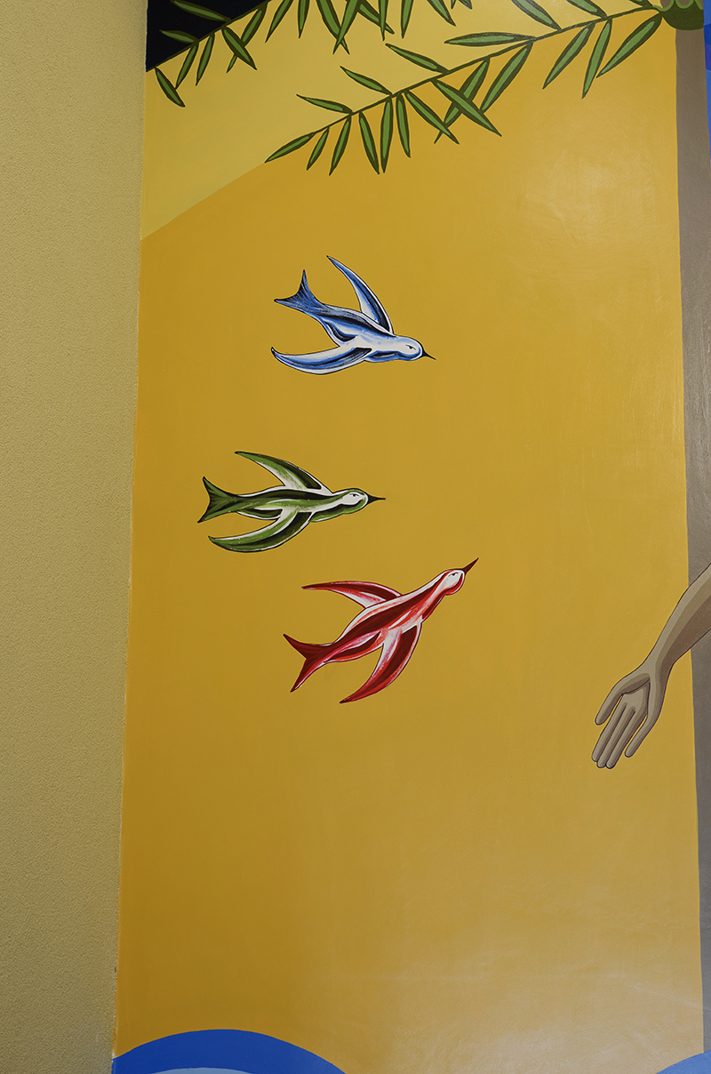 Em cores térreas a cena lembra o calor escaldante do deserto, mas a vida de Deus lança fundamentos para a travessia do deserto (vida) infunde, pois Deus nos que recebem o batismo em Cristo as três virtudes teologais Fé, Esperança e Caridade a simbologia das três aves denotam estas virtudes para todos os cristãos.