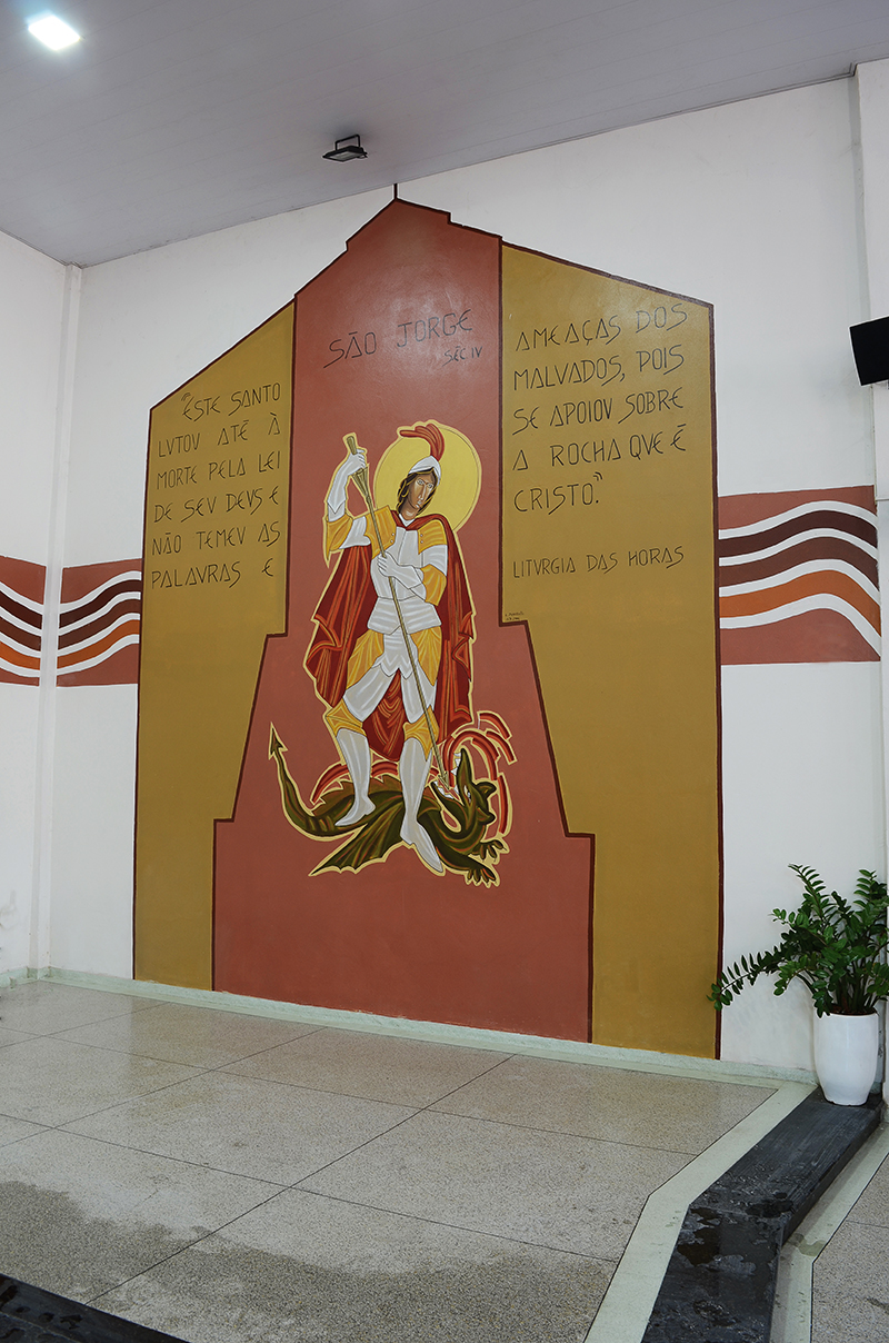Opostamente à Mãe de Deus se encontra a arte alusiva ao padroeiro São Jorge do século IV d.C.
