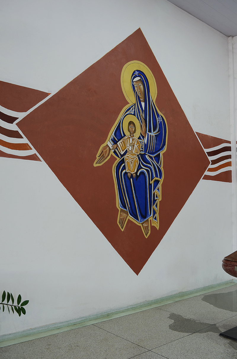 Junto à fonte batismal se delineia a figura de Maria, a Mãe de Cristo, como nova Eva ela recebe os novos filhos e filhas em adoção pelo batismo.