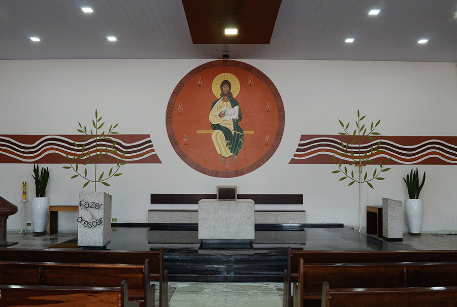Foi inspirado na simbologia da luz que a arte contempla Jesus inserido dentro de uma esfera em cor quente como dizer do sol. O Cristo de forma magistral abre sua vida (Evangelho) e se manifesta como luz para os povos e nações.