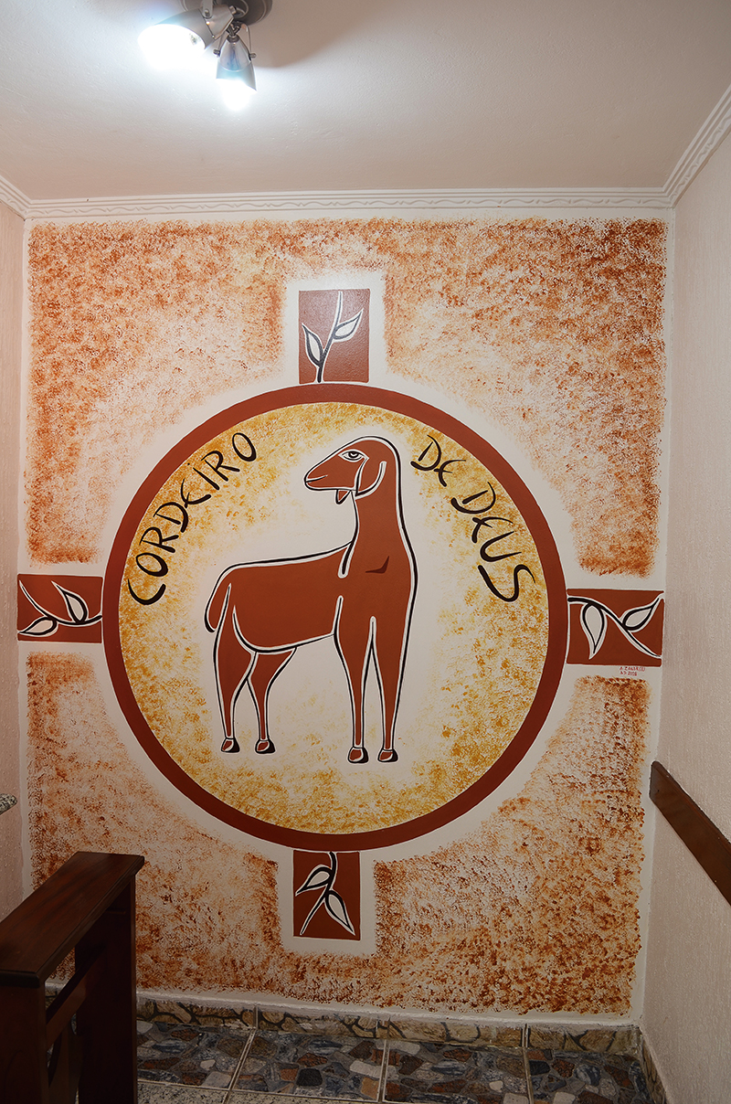 Expressa esta diversidade na unidade o círculo que emoldura a Cristo trazendo formas geométricas em forma de vitral em tons vermelho, amarelo e laranja.