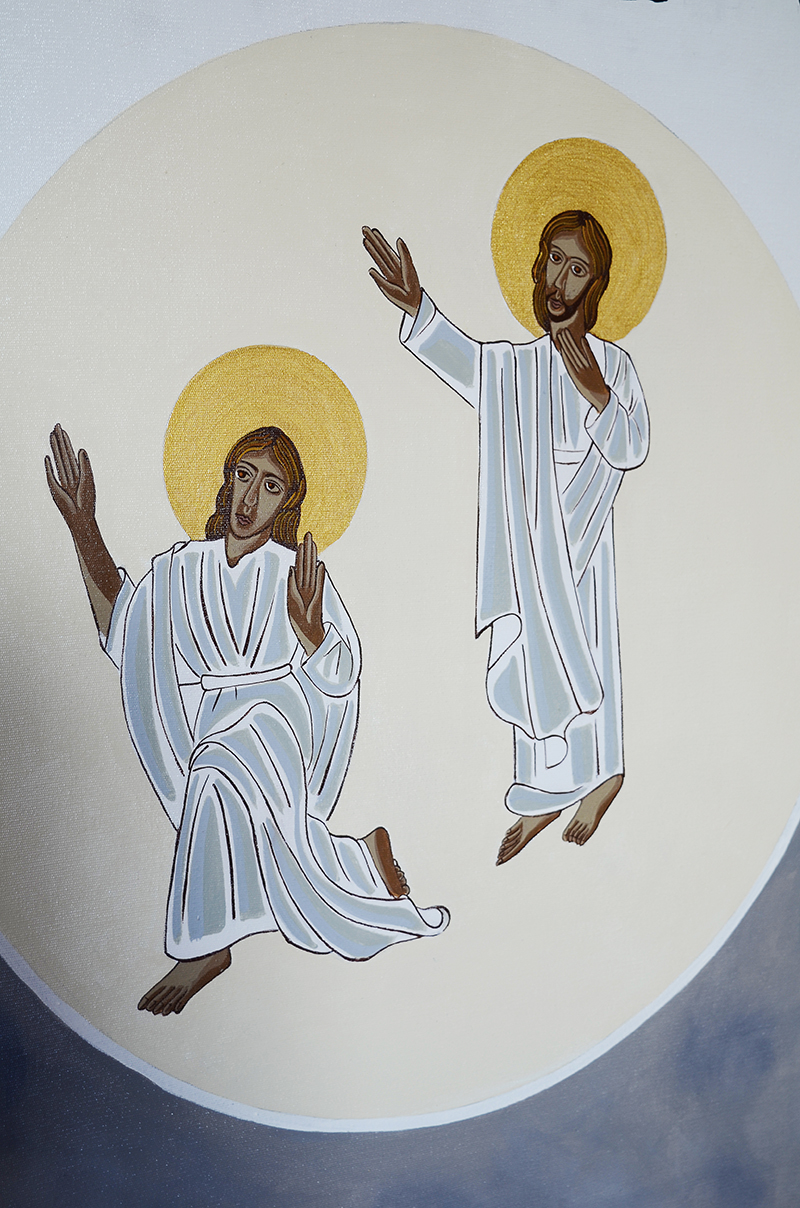 Neste plano estão os discípulos Pedro, Tiago e João convidados por Jesus a estarem com ele na Montanha Sagrada (Tabor). São eles chamados como todos os batizados a participarem da vida divina, assim eles se encontram trajando branco e dentro dos círculos na cor pérola.