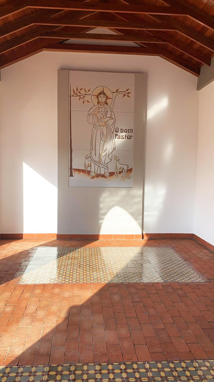 Uma ovelha é acolhida no braço esquerdo de Jesus simbolizando os que mais necessitam de cuidado diante de suas fragilidades, outra olha confiante na esperança da Vida que advém da face bendita e divina de Jesus e outra que encontra abrigo e proteção ao se colocar por detrás e com profundo desejo de escutar e seguir a voz do Bom Pastor.