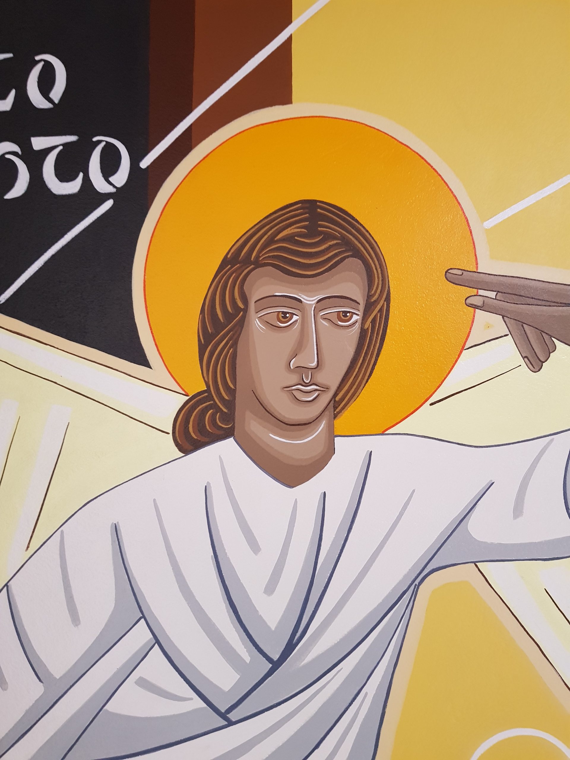 Ao lado oposto desta arte, lado direito de quem entra pela porta central está a arte representativa de Jesus na Sinagoga de Nazaré.