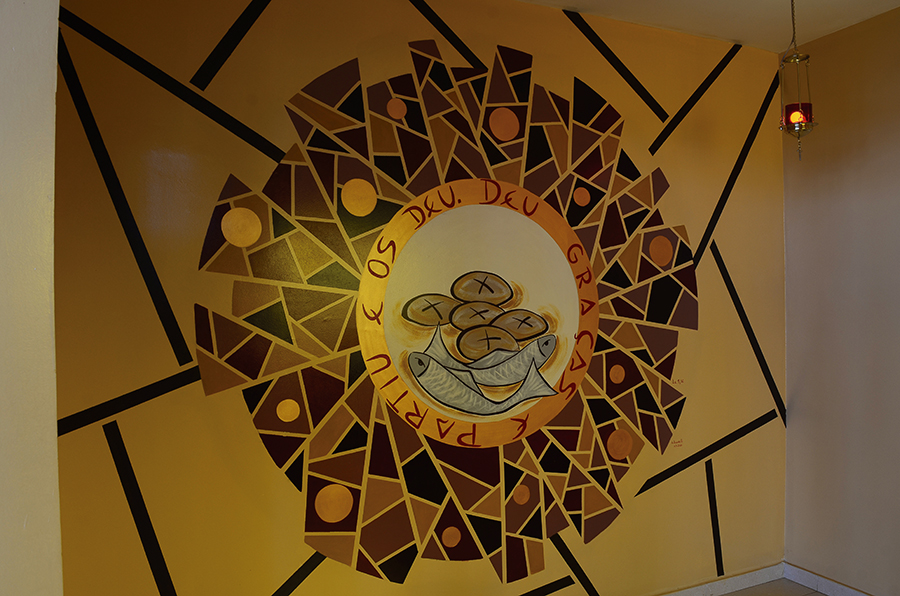 A arte contempla em dois círculos em ocre recordando nossa humanidade (tom terra) a unidade entre o Pai e o Filho procedendo de ambos o Santo Espírito, assim acima temos o sinal do Espírito (pombo) e abaixo o Ressuscitado celebrado em cada liturgia. Continue lendo “Igreja do Espírito Santo – Araras – SP”